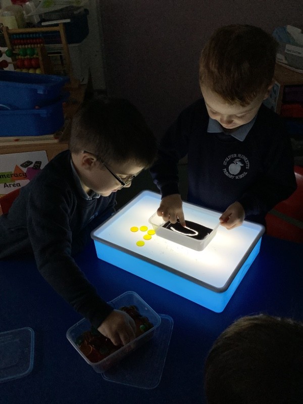 Our light tables have provided even more opportunities for exploration. Children enjoyed investigating transparent shapes and numbers, forming letters with counters, and writing in black sand. They also used tongs to copy colour patterns with balls in test tubes—another excellent fine-motor challenge!